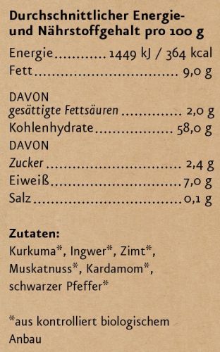 Die Gewürzmischung Goldene Milch ist eine Pulvermischung aus ausgewählten, pflanzlichen Zutaten aus rein biologischem Anbau. Diese enthält vermahlene Kurkumawurzel, aromatischen Zimt, Ingwer, würzige Muskatnuss, Kardamom und einen Hauch von schwarzem Pfeffer. Durch die Kombination aus wertvollen Gewürzen hat die Goldene Milch nicht nur einen belebenden und vitalisierenden Effekt, sondern schmeckt außergewöhnlich würzig und aromatisch.